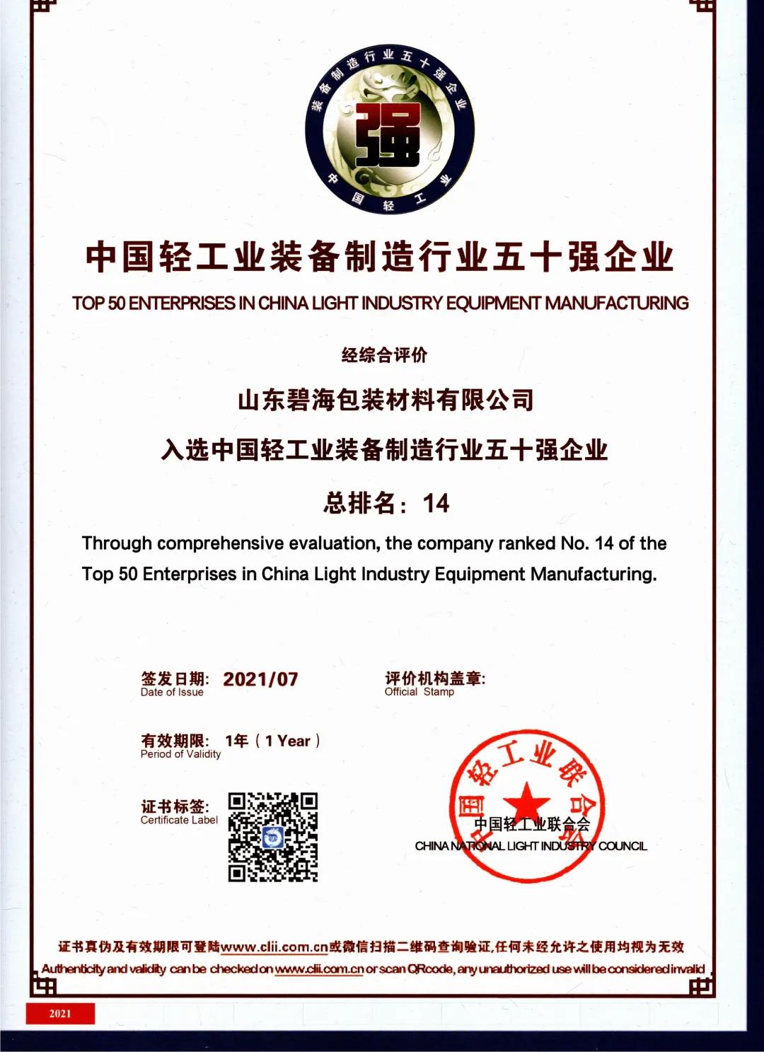 2021年7月20日,在北京召開(kāi)的“奮進(jìn)‘十四五’領(lǐng)航新消費(fèi)”中國(guó)輕工業(yè)百?gòu)?qiáng)企業(yè)高峰論壇上,碧海公司入選中國(guó)輕工業(yè)裝備制造行業(yè)五十強(qiáng)企業(yè)(排名14)、中國(guó)液態(tài)食品機(jī)械行業(yè)十強(qiáng)企業(yè)(排名4),這是對(duì)我公司綜合實(shí)力、創(chuàng)新成就的高度肯定和認(rèn)可。