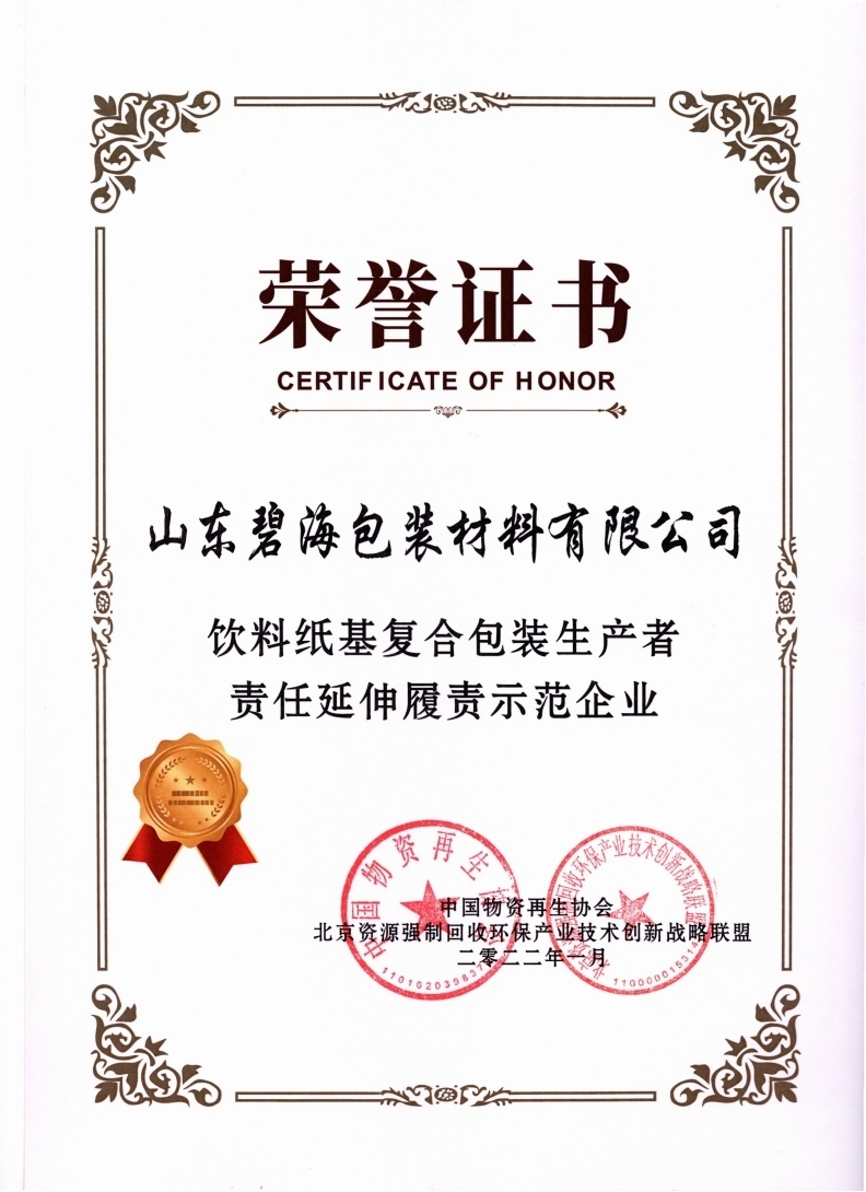 2022年1月12日,中國飲料紙基復合包裝可持續(xù)發(fā)展協(xié)作體2021年度會議在北京召開。會議對碧海公司在2021年推行環(huán)境友好包裝設(shè)計、開發(fā)可再生原料包裝、共建飲料紙基復合包裝回收協(xié)作體、規(guī)范回收利用等方面的工作給予了肯定,授予“飲料紙基復合包裝生產(chǎn)者責任延伸履責示范企業(yè)”榮譽稱號。